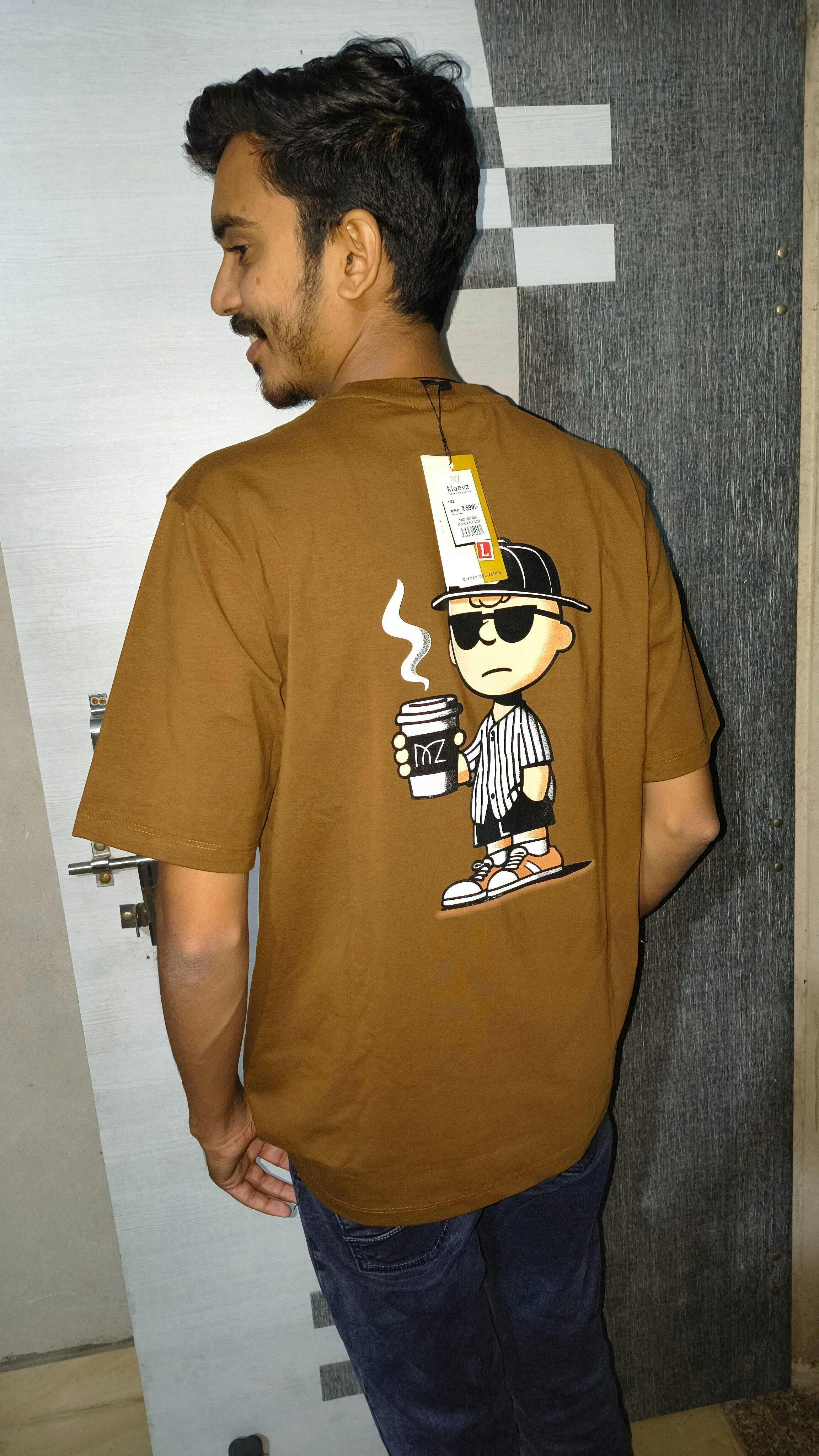 Cartoon Art Down Shoulder T-Shirt - Camel Brown